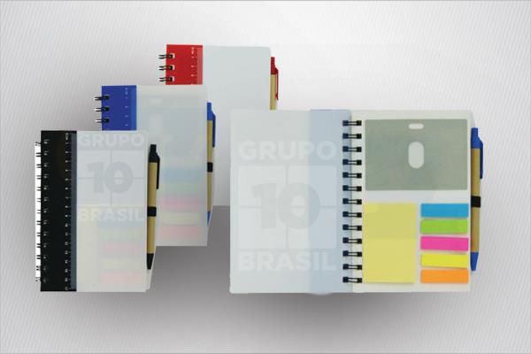 Bloco de anotações multiuso capa branca com espiral preto. Possui: régua de 17cm na capa, porta cartão plástico, cinco blocos autoadesivos coloridos com 25 folhas cada, bloco amarelo com 25 folhas, 70 folhas pardas pautadas com logo reciclado no canto inferior direito e suporte elástico com caneta ecológica de papelão(clip e ponteira plástico). Tamanho total aproximado (CxL): 17,7 cm x 13,5 cm. Gravação em 1 cor na capa do bloco já incluso.